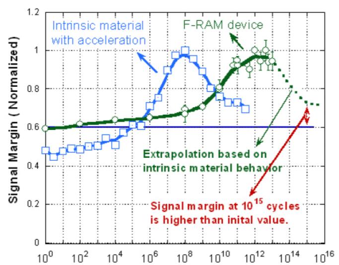 圖1.FRAM器件和本征材料的信號裕量與周期的關(guān)系圖顯示,與初始值相比,F(xiàn)RAM器件在1015個周期時的信號裕量更高。