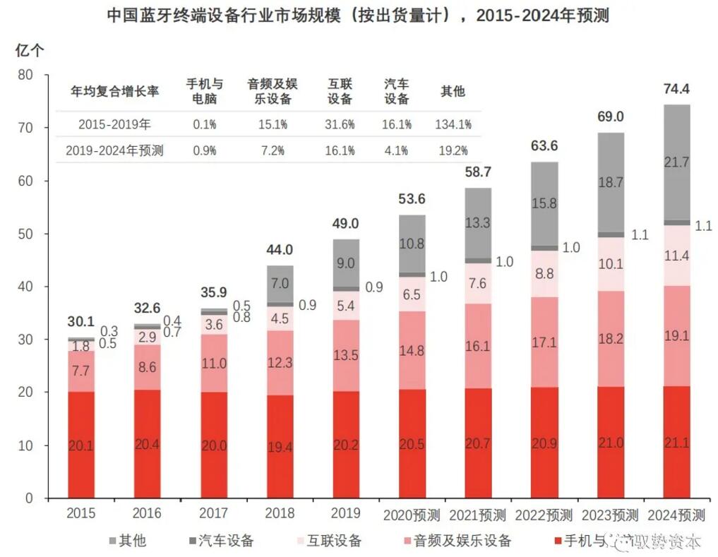 便捷式無線揚聲器、TWS耳機和智能音箱的市場規模快速增長,意味著消費者對藍牙無線音頻設備的接受度較高。預計至2024年,近97%的揚聲器采用藍牙技術,從而推動藍牙音頻終端設備出貨量增長。