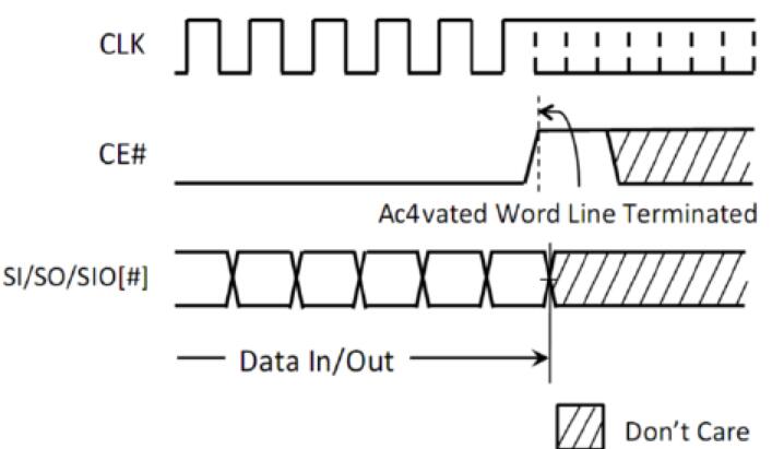 所有所有讀和寫都必須由CE#從低到高完成。CK#的上升沿是終止已激活的讀/寫字線并將設備設置為待機狀態的觸發器,否則將阻止內部刷新操作,直到設備看到讀/寫字線已終止,無需執行命令終止操作僅適用于讀取和寫入操作以及任何命令操作,例如Enter Quad模式命令和Reset命令。