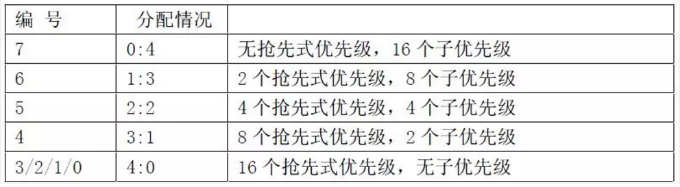 20、(NestedVectored Interrupt Controller)NVIC嵌套向量中斷控制器,分為兩種:搶先式優先級(可嵌套)和中斷優先級(副優先級,不能嵌套)。兩種優先級由4位二進制位決定。分配下來有十六種情況: