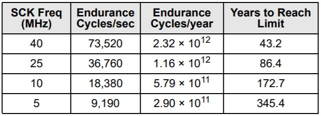 FeRAM存儲(chǔ)器具有讀取和還原機(jī)制。因此,對于存儲(chǔ)陣列的每次訪問(讀取或?qū)懭耄瑢葱惺┘幽途弥芷凇?FRAM體系結(jié)構(gòu)基于每個(gè)64位的16K行的行和列的陣列。整個(gè)行在內(nèi)部訪問一次,無論是讀取還是寫入一個(gè)字節(jié)或全部八個(gè)字節(jié)。在耐久性計(jì)算中,該行中的每個(gè)字節(jié)僅被計(jì)數(shù)一次。下圖顯示了一個(gè)64字節(jié)重復(fù)循環(huán)的耐久性計(jì)算,該循環(huán)包括一個(gè)操作碼,一個(gè)起始地址和一個(gè)順序的64字節(jié)數(shù)據(jù)流。這將導(dǎo)致每個(gè)字節(jié)在整個(gè)循環(huán)中經(jīng)歷一個(gè)持久周期。即使在40 MHz時(shí)鐘速率下,F(xiàn)RAM的讀寫持久性實(shí)際上也是無限的。