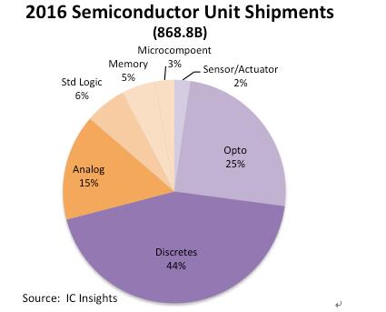 出乎意外的是,商用分立器件(二極管、晶體管、整流器和晶閘管)出貨量占比達到了44%。通信與消費電子仍然是分立器件最大的應用市場,但車載分立器件出貨量增速很快,因為汽車安全與節能的需求,越來越多的分立器件被應用于汽車上。分立器件主要用于電路保護、電源管理、大電流切換、信號調理以及射頻功放等領域,小信號晶體管也被廣泛用在集成電路的周邊或被集成在內部,用于修復問題或優化系統性能。
