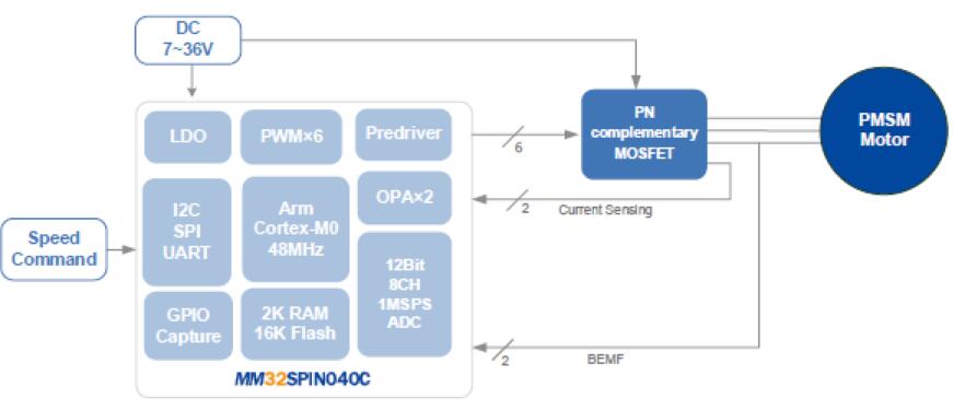 方案采用的主控MM32SPIN040工作頻率可達(dá)48MHz,內(nèi)置16KB Flash,2KB SRAM高速存儲(chǔ)器,針對(duì)電機(jī)應(yīng)用內(nèi)置2個(gè)運(yùn)放,預(yù)驅(qū)工作電壓高達(dá)36V。適合于三相永磁無(wú)刷電機(jī),電動(dòng)工具等多種應(yīng)用場(chǎng)合。該方案適用于落地扇、塔扇、循環(huán)扇、吊扇等多種品類(lèi)的風(fēng)扇設(shè)備。我司英尚微可提供高速吹風(fēng)筒、電扇等各種電機(jī)應(yīng)用方案。