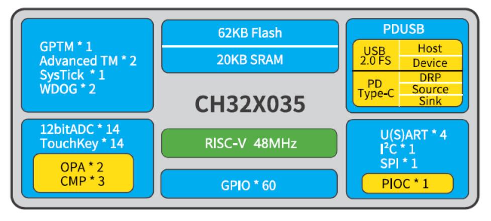 CH32X035系列是基于青稞V4C內(nèi)核設(shè)計的工業(yè)級微控制器。內(nèi)置USB和PD PHY,支持USB Host主機(jī)和USBDevice設(shè)備功能、PDUSB及Type-C快充功能,內(nèi)置可編程協(xié)議I/O控制器,提供OPA運放、CMP電壓比較器、USART串口、/2C、SPI、定時器、12位ADC、Touchkey等豐富外設(shè)資源。