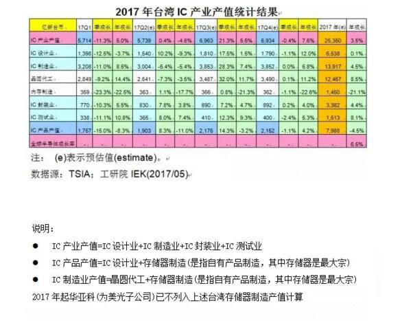 根據(jù)臺(tái)灣地區(qū)工研院IEK與TSIA的最新統(tǒng)計(jì),臺(tái)灣地區(qū)2017年第一季(17Q1)整體IC產(chǎn)業(yè)產(chǎn)值(含IC設(shè)計(jì)、IC制造、IC封裝、IC測(cè)試)達(dá)新臺(tái)幣5,714億元(USD$18.3B),較上季(16Q4)衰退11.3%,較去年同期(16Q1)成長(zhǎng)5.0%。