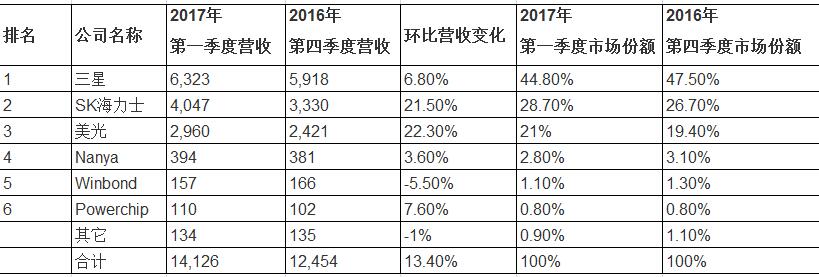 根據(jù)Trendforce公司旗下DRAMeXchange事業(yè)部公布的最新統(tǒng)計數(shù)據(jù)顯示,在2017年首季中,內(nèi)存組件的整體銷售額達到刷新紀錄的141億美元,較上年同期增長達13.4%。