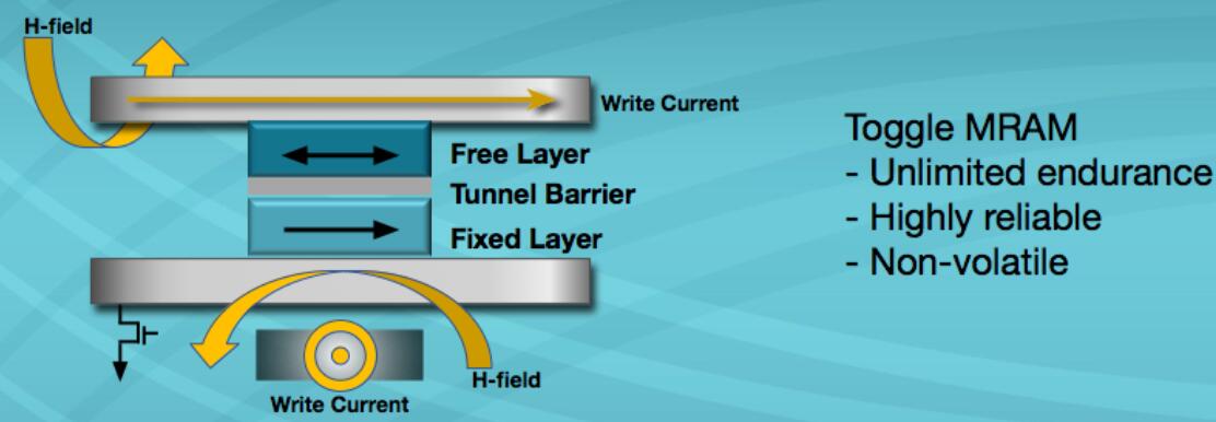 切換MRAM使用1個(gè)晶體管,1個(gè)MTJ單元來提供簡(jiǎn)單的高密度存儲(chǔ)器。Everspin使用獲得專利的Toggle電池設(shè)計(jì),可提供高可靠性。數(shù)據(jù)在溫度下20年始終是非易失性的。