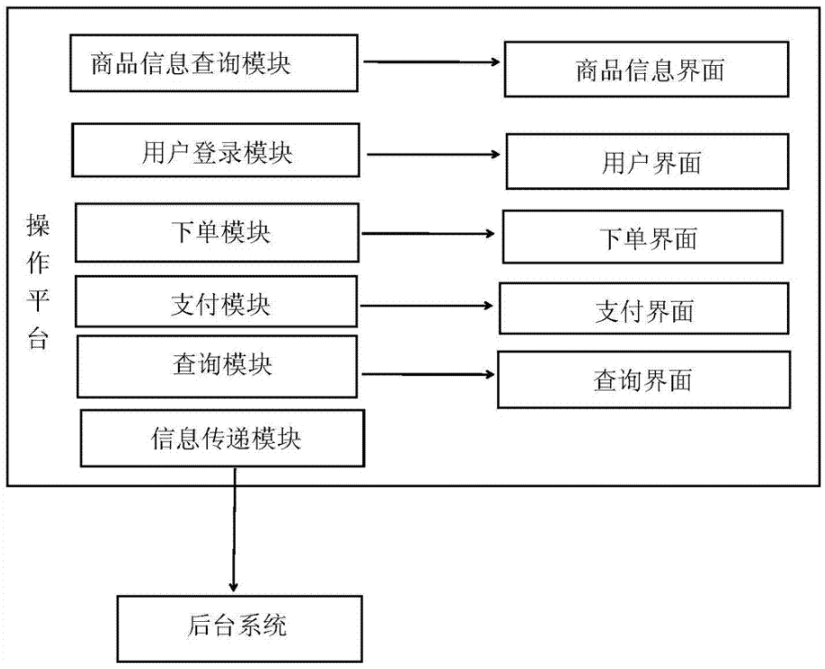 基于實(shí)物展示的共享網(wǎng)絡(luò)銷(xiāo)售柜,該銷(xiāo)售柜柜設(shè)有多個(gè)展示臺(tái)和操作電腦;展示臺(tái)用以擺放展示商品,展示柜分為多層多格,用以存放不同的物品;操作電腦連通公共網(wǎng)絡(luò),具有主機(jī)和操作平臺(tái);操作平臺(tái)上設(shè)有商品信息查詢模塊,用戶登錄模塊,下單模塊,支付模塊,查詢模塊和信息傳遞模塊;買(mǎi)家通過(guò)展示臺(tái)選中商品后,在操作平臺(tái)上登錄商品信息查詢模塊,通過(guò)該商品信息查詢模塊的商品信息界面了解商品信息,通過(guò)用戶登錄模塊的用戶界面登錄,通過(guò)下單模塊的下單界面購(gòu)買(mǎi)商品,通過(guò)支付模塊的支付界面完成付款和打印發(fā)票,通過(guò)查詢模塊的查詢界面查詢購(gòu)買(mǎi)信息;信息傳遞模塊將用戶購(gòu)買(mǎi)信息通過(guò)網(wǎng)絡(luò)發(fā)送給商家;商家接收到購(gòu)買(mǎi)信息后,通過(guò)物流將產(chǎn)品發(fā)送給買(mǎi)家。