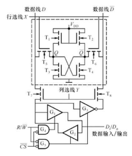 其中存儲單元通過T5、T6和數(shù)據(jù)線(位線)相連;數(shù)據(jù)線又通過T7、T8和再經(jīng)輸入/輸出緩沖電路和輸入/輸出線相連接,以實(shí)現(xiàn)信息的傳遞和交換。寫入信息的操作過程,在第一次寫入信息之前,存儲單元中的信息是隨機(jī)信息。