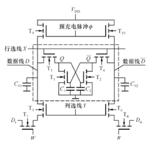 補(bǔ)充充電的過程:加預(yù)充電脈沖∅、預(yù)充電管T9、T10導(dǎo)電,CO1,C02很快充電至VDD,∅撤銷后,CO1,CO2上的電荷保持。然而進(jìn)行讀出操作:地址有效,行、列選線X、Y高電平;R=1,W=0進(jìn)行讀出操作,如果原信息為Q=“1”,說明MOS電容C2有電荷,C1沒有電荷(即T2導(dǎo)電,T1截止);這時CO1上的電荷將對C2補(bǔ)充充電,而CO2上的電荷經(jīng)T2導(dǎo)電管放掉,結(jié)果對C2實(shí)現(xiàn)了補(bǔ)充充電。讀出的數(shù)據(jù)仍為,