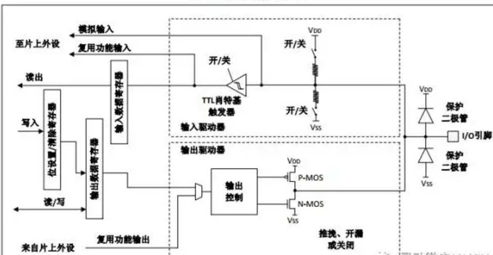 模擬輸入是指模擬信號的輸入。配置模擬輸入時,所有的上拉、下拉電阻和施密特觸發器,均處于禁止狀態,因此“輸入數據寄存器”將不能反映端口上的電平狀態,也就是說模擬輸入配置下,CPU不能在“輸入數據寄存器”上讀到有效的數據。