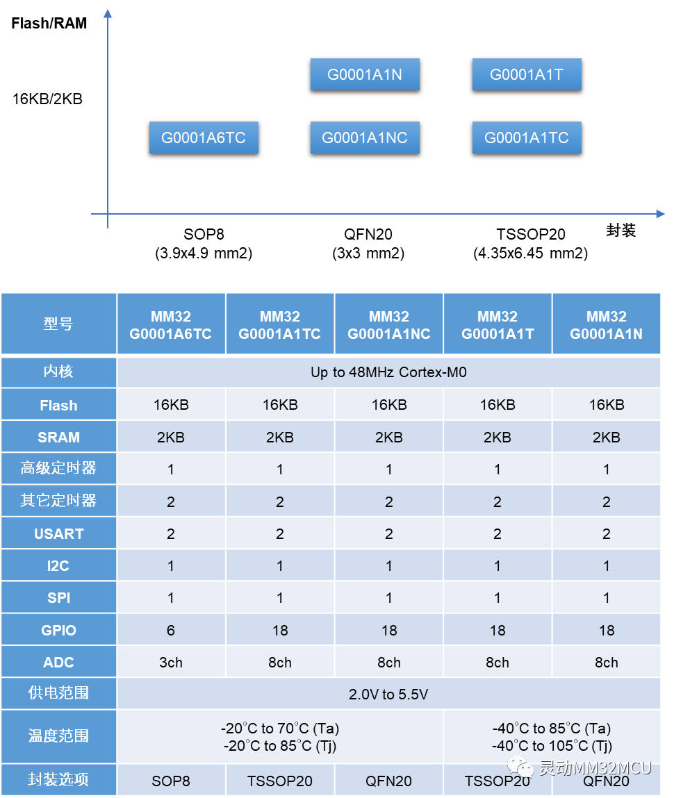 MM32G0001提供TSSOP20,QFN20和SOP8三種封裝,提供-40~85℃工業級和-20~70℃消費級環境溫度選項,共推出5款型號可供選擇。支持為特定客戶和應用定制DFN、DIP和SOP等常見的小引腳封裝。