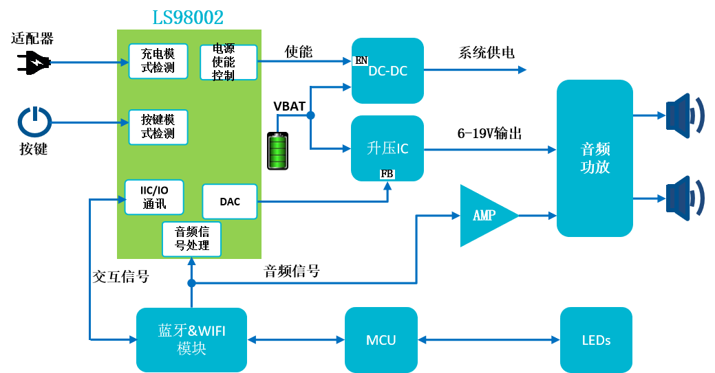 現(xiàn)場可重構(gòu)IC、通用可配置的模數(shù)混合芯片內(nèi)部集成豐富的模擬資源和數(shù)字資源,可輕松替代電路中的各種標準器件,并按照客戶要求組合成最優(yōu)小型ASIC,縮短開發(fā)周期,降低成本。下面介紹LS98002現(xiàn)場可重構(gòu)CPLD芯片應用案例—藍牙音箱。