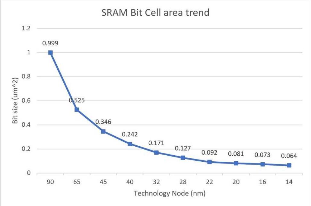 圖2位單元趨勢顯示隨著過程節(jié)點(diǎn)縮小,縮放比例逐漸減小。