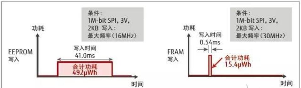 另外與同為非易失性存儲(chǔ)器的通用EEPROM相比,MB85RS1MT的寫入時(shí)間較短,從而能夠大幅降低寫入時(shí)的功耗。