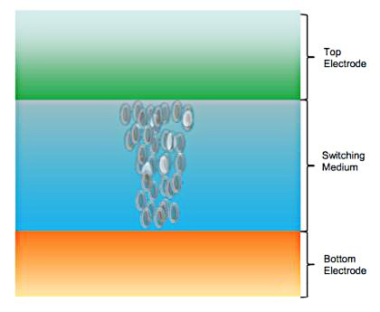 OxRAM 和 CBRAM 都是二端器件——由一個(gè)頂部電極和一個(gè)底部電極組成。在兩個(gè)電極之間是開關(guān)介質(zhì)。